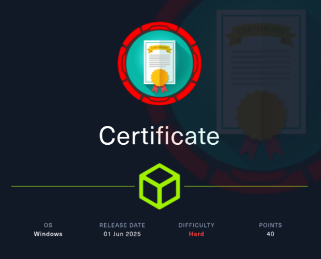 Certificate is a hard-difficulty windows machine from Hack The Box where -> Bypass upload filter (zip) upload PHP webshell → RCE -> Dump DB / extract password hash → crack locally → use credentials. -> Analyse PCAP → extract Kerberos ticket/hash → crack with hashcat → compromise next user. -> Exploit ESC in ADCS → gain ADCS privileged user → exfiltrate ADCS private key. -> Golden Certificate attack (use ADCS key to mint cert) → impersonate Administrator → read root flag.