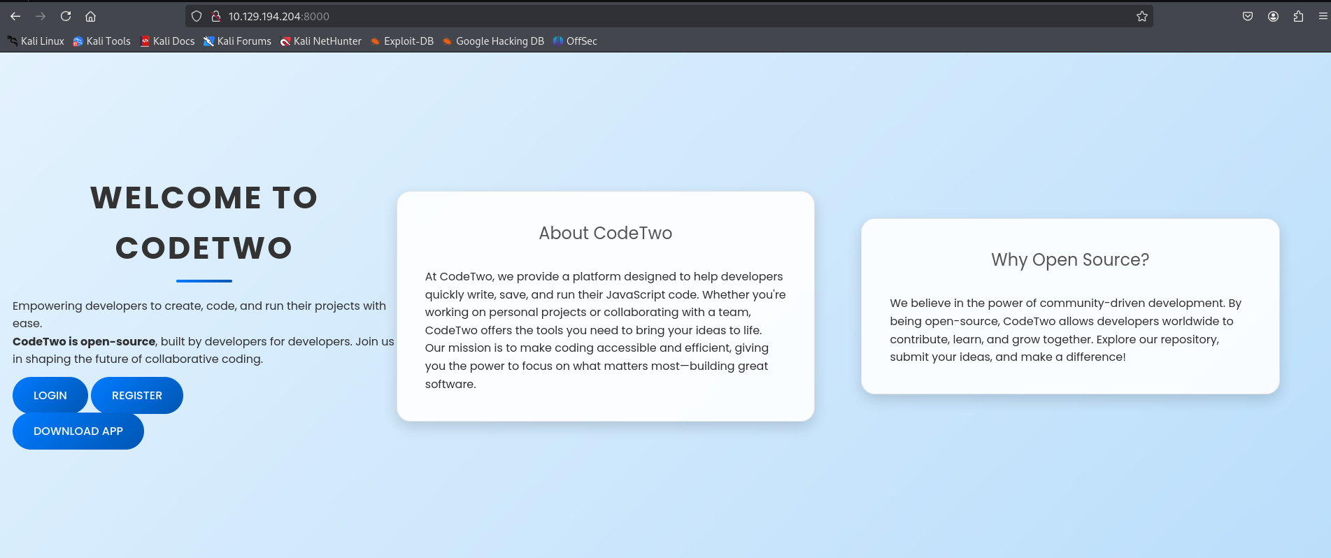 So we have a website talking about platform that is likely to be open-source one. We have an interesting button that can download an app in our local machine and also we have a login page with also registration. Let’s start by downloading and navigating the APP directory first.