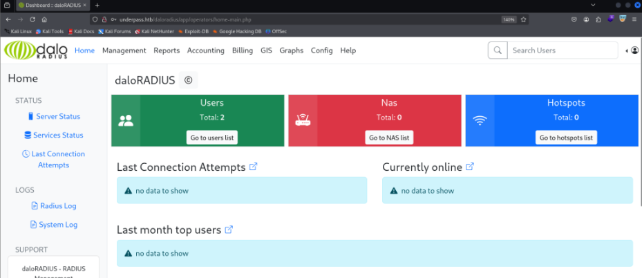 UnderPass is an easy-difficulty machine from Hack The Box that starts with an exposed Daloradius instance, accessible using default credentials. Inside the application, we discover a password hash which we successfully crack. The recovered credentials allow SSH access to the target machine. Once on the box, we find that we can launch a mosh server with root privileges, which we exploit to escalate our privileges and ultimately gain root access.