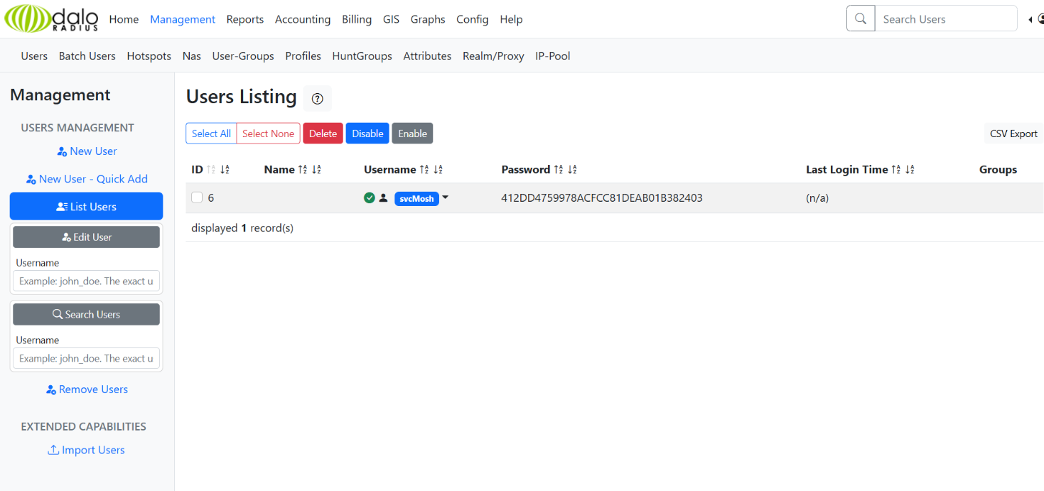 - Retrieving User Hash Inside DaloRadius, we find a user